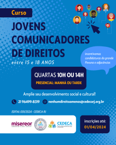 👐 O CEDECA RJ convida para o Curso de Jovens Comunicadores de Direitos, para participação de 25 adolescentes e jovens entre 15 e 18 anos que desejam ampliar seu desenvolvimento social e cultural.