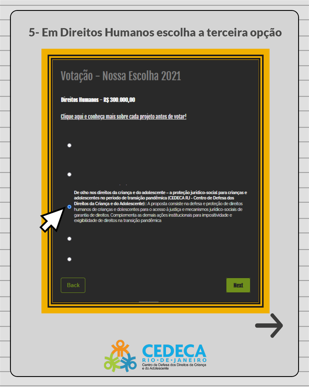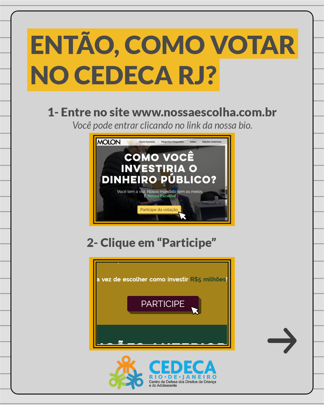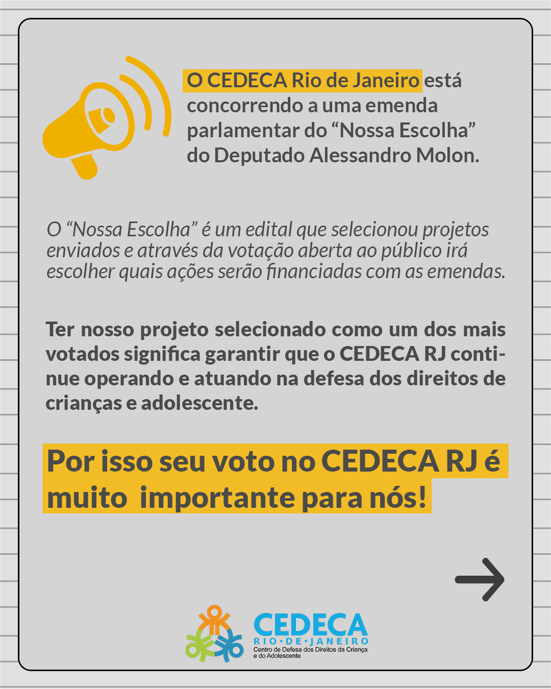 Ajude votando neste projeto. É necessário fazer um pequeno cadastro. O CEDECA RJ está na 4ª aba de rojetos e os mais votados serão financiados com a emenda.