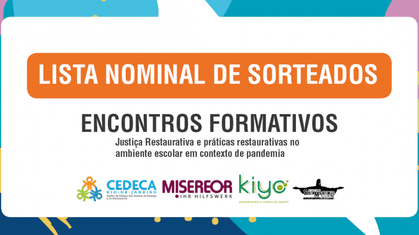 O Centro de Defesa dos Direitos da Criança e do Adolescente do Rio de Janeiro – CEDECA RJ divulga a lista nominal de sorteados para os Encontros Formativos online com o tema: Justiça Restaurativa em contexto de pandemia. O curso integra as atividades do projeto: EFETIVAÇÃO DE DIREITOS DE CRIANÇAS