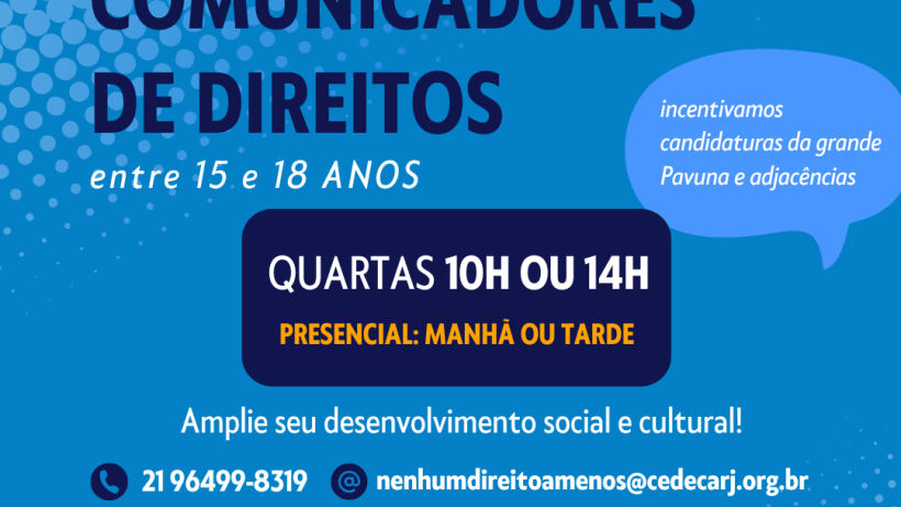 BORA!!! 📣📣📣 👐 O CEDECA RJ convida para o Curso de Jovens Comunicadores de Direitos, para participação de 25 adolescentes e jovens entre 15 e 18 anos que desejam ampliar seu desenvolvimento social e cultural. 🔹O curso ocorrerá na sede do CEDECA RJ de 17/04/2024 à 29/05/2024, às quartas-feiras, turmas