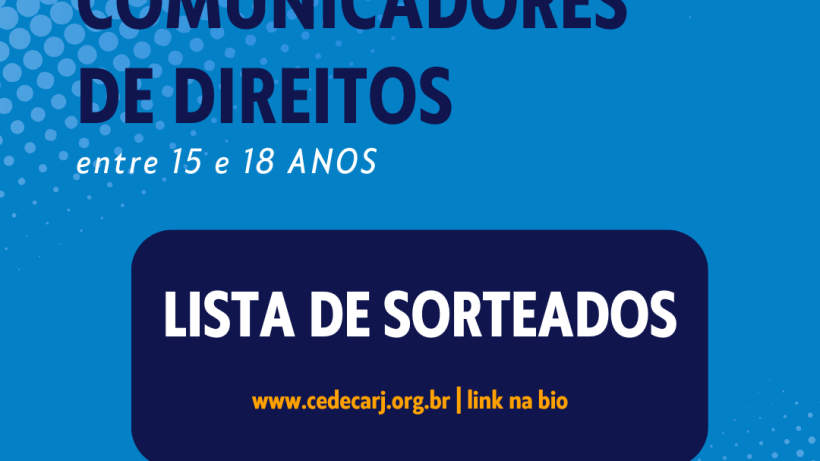 💬Trazemos hoje a lista de SORTEADOS no Curso de Jovens Comunicadores de Direitos 2024! Dentre os 40 inscritos realizamos um sorteio como estabelecido no Edital 001/2024. 🔷 Caso seu nome esteja na lista: Parabéns! Aguarde o agendamento nos próximos dias através do nosso contato ainda essa semana. 🔶 Caso seu