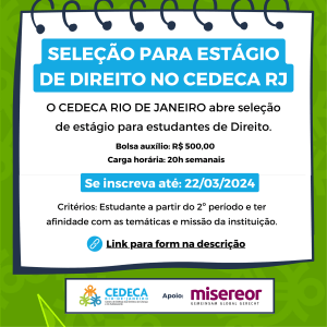 📚O CEDECA RIO DE JANEIRO abre seleção de estágio para estudantes de Direito.